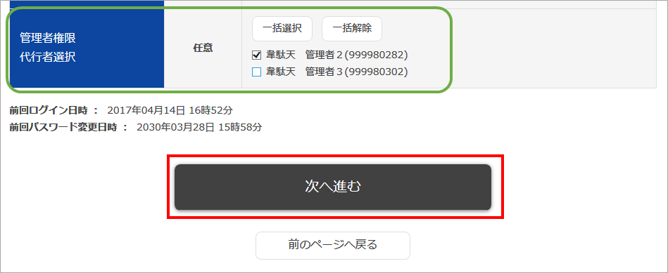代行者にする管理者を選択をしたら、「次へ進む」ボタンをクリックします。