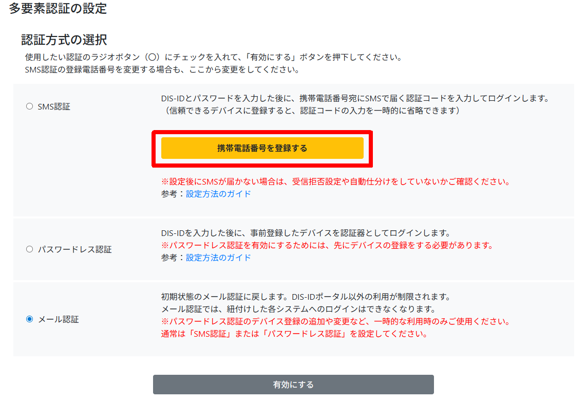 DIS-IDの管理者に、認証方式および携帯電話番号の設定内容を確認してもらってください。