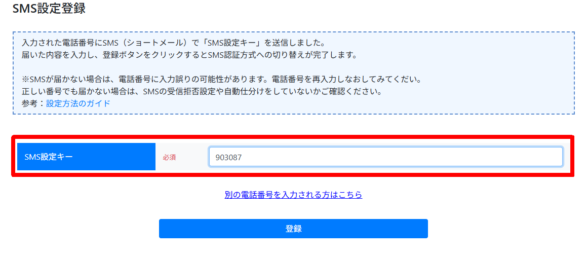 SMS設定キーの入力欄に、通知された「SMS設定キー」を入力してから「登録」ボタンをクリックしてください。