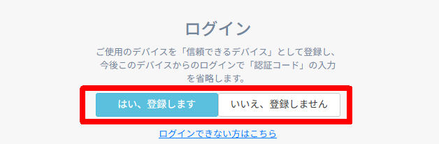 認証コードを入力した後、信頼済みデバイスとして登録するかどうかの確認画面が表示されます。