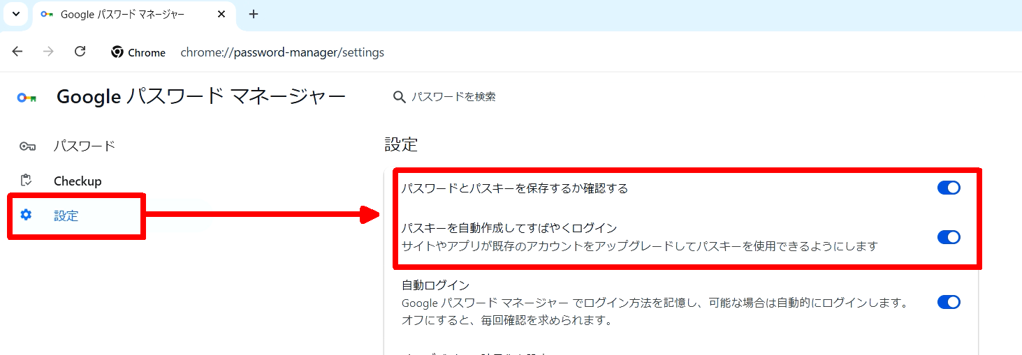 これで、Googleパスワードマネージャーのパスキーの保存設定は完了です。