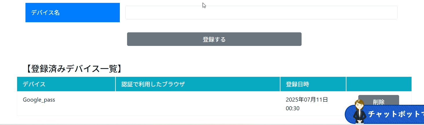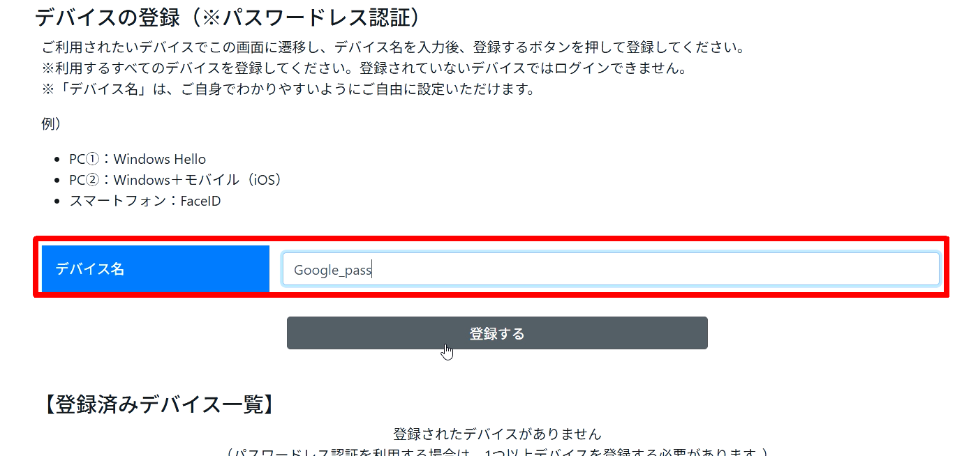 「デバイス名」に登録名を自由入力の上、「登録する」ボタンをクリックしてください。