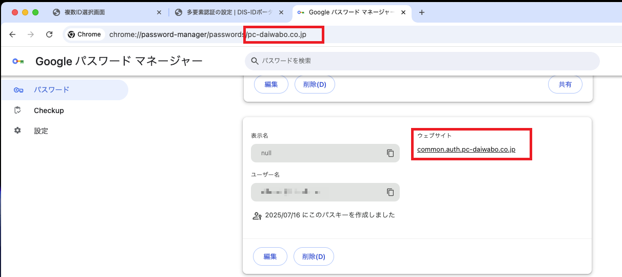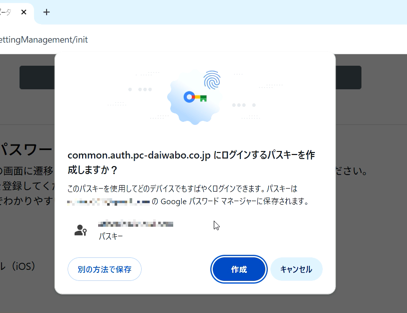 登録したパスキーはGoogleパスワードマネージャーに「common.auth.pc-daiwabo.co.jp」として表示されます。