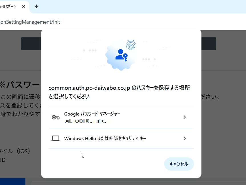 ご利用者様の会社のポリシーによってはパスキーの保存などがご利用いただけない場合もございます。