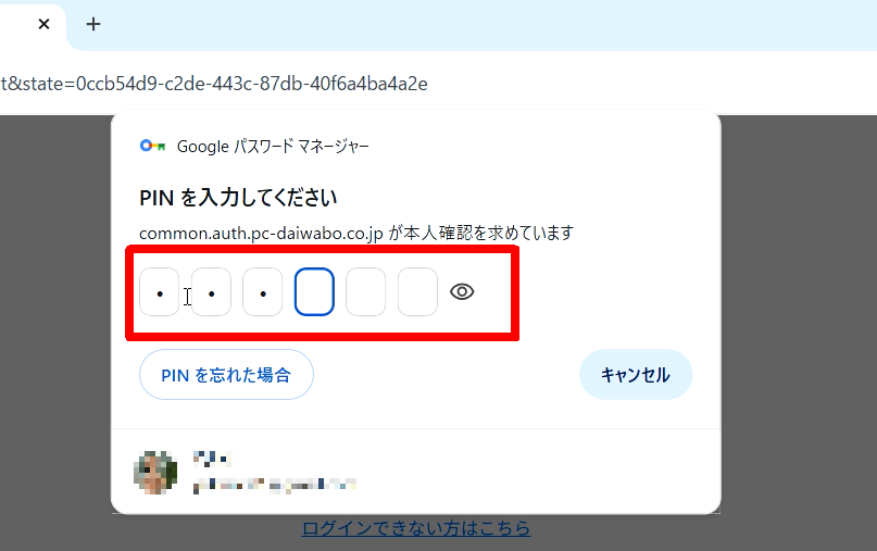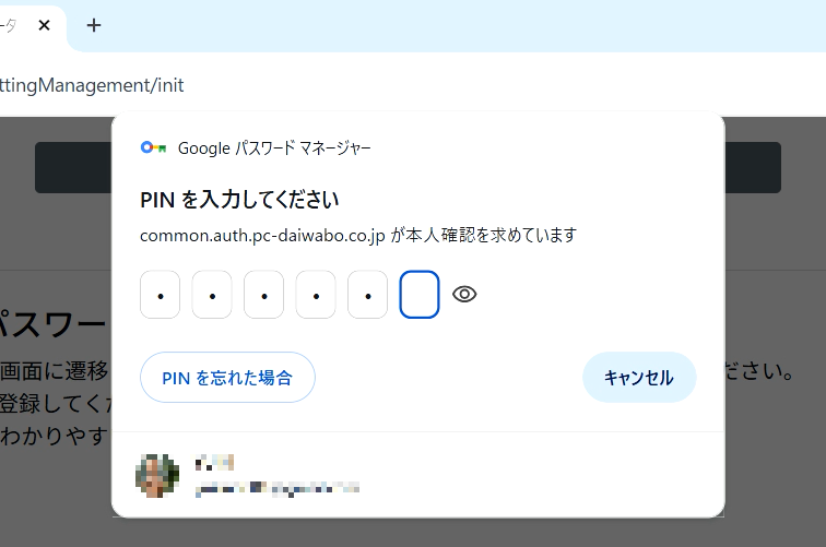 このPINはGoogleパスワードマネージャー専用の認証コードです、利用者にて設定されたPINコードを入力してください。