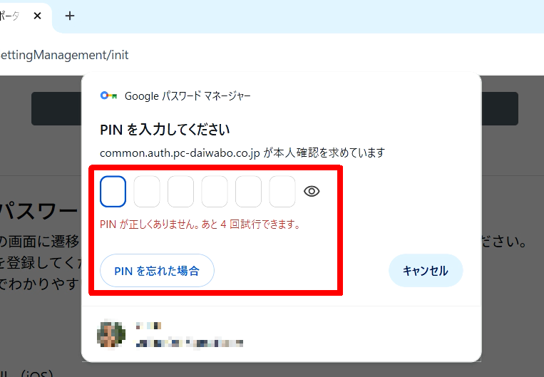 このPINはGoogleパスワードマネージャー専用の認証コードです、利用者様にて設定されたPINコードを入力してください。
