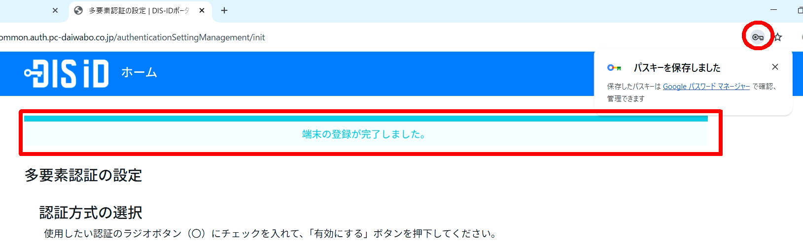Chromeブラウザには「パスキーを保存しました」と表示されます。