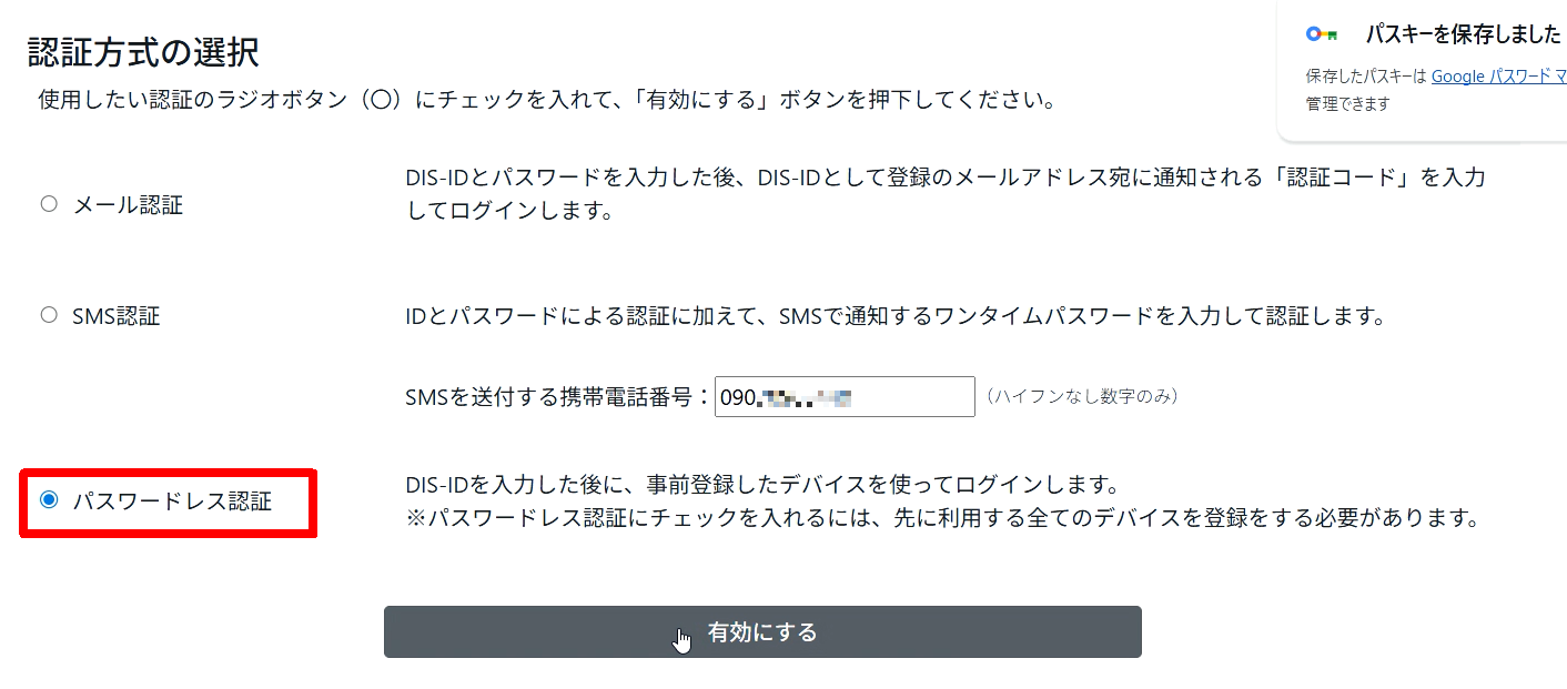 パスワードレス認証を選択して、「有効にする」ボタンをクリックします。