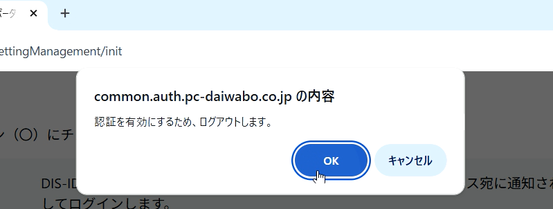 パスワードレス認証に認証方式を切り替えるために、ログアウト確認のダイアログが表示されます。問題なければ「OK」をクリックします。
