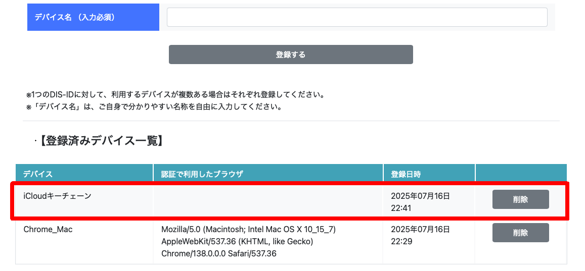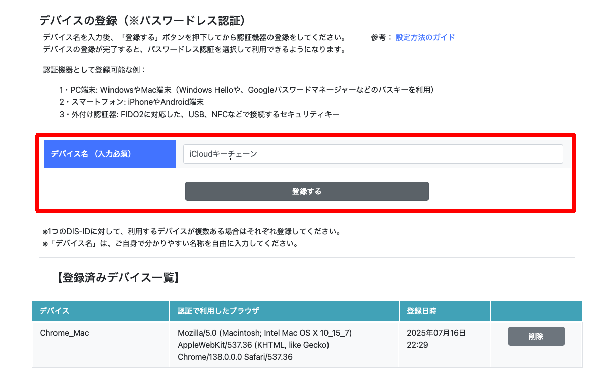 ※デバイスごとに個別登録する必要はありません。同じDIS-IDのパスキーがすでに登録されている場合、追加登録はできません。