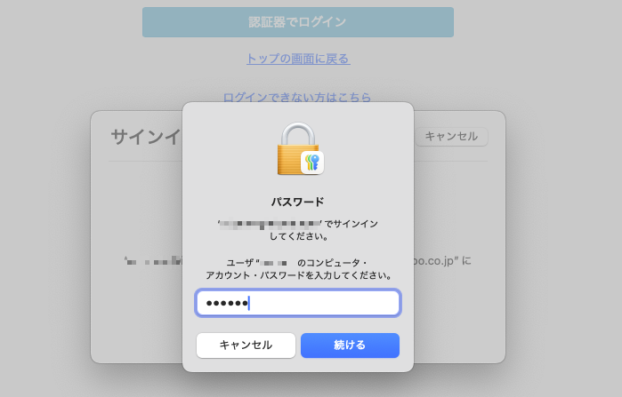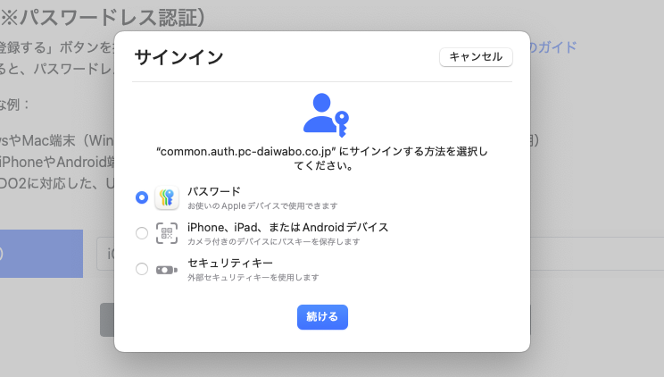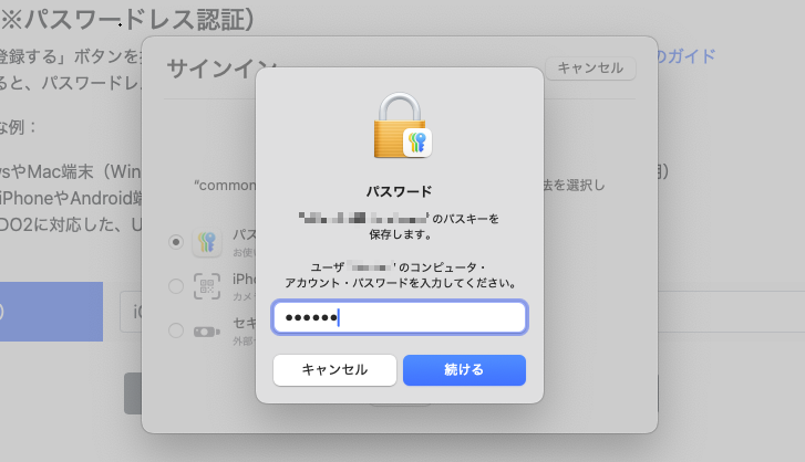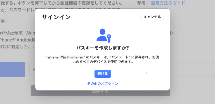 今回はiCloudキーチェンにパスキーを保存するので、「続ける」ボタンを選択してください。
