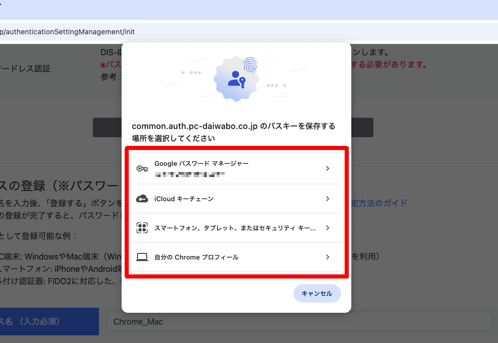 下図はChromeの例で、「iCloudキーチェーン」または「Googleパスワードマネージャー」を保存先として選択できます。