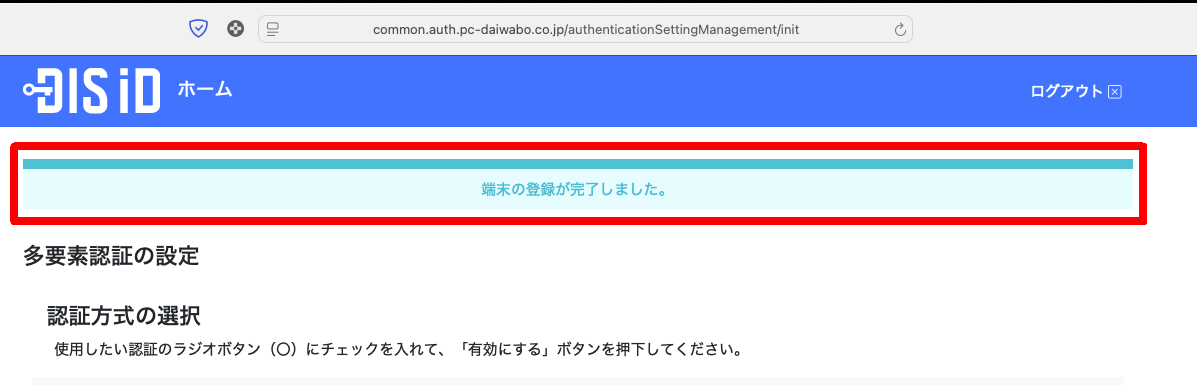 多要素認証の設定画面下部の【登録済みデバイス一覧】には、登録したデバイス名が表示されます。登録デバイス一覧に表示されれば、デバイスの登録は完了です。