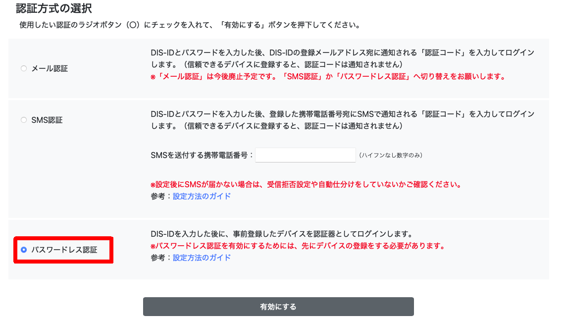 パスワードレス認証を選択して、「有効にする」ボタンをクリックします。