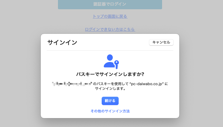 ※パスワードの入力画面が表示された場合は、パスワードレス認証の設定が完了していません。(メール認証かSMS認証になっています)