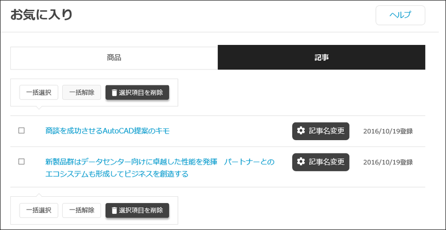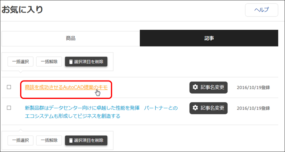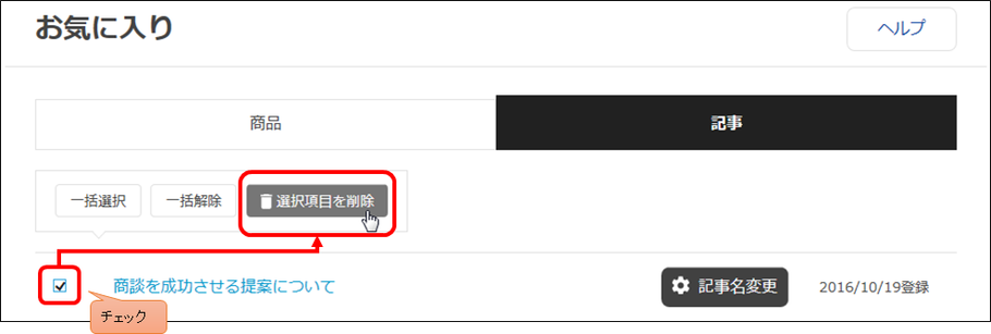 削除したい記事タイトルの左側にあるチェックボックスにチェックをし、リストの上下にある「選択項目を削除」ボタンをクリックすると、リストから記事が削除されます。