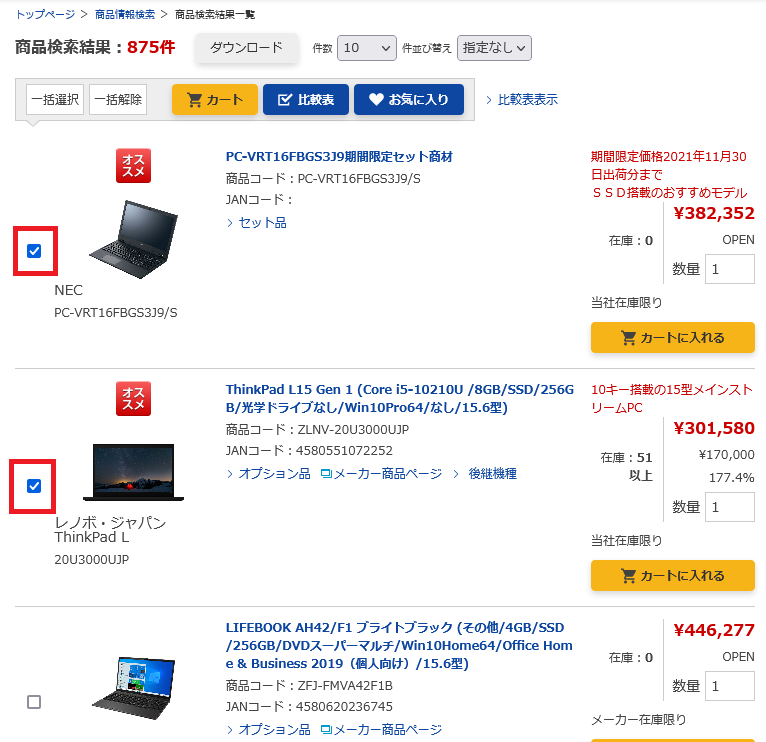 1・商品検索を行い、検索結果一覧画面の左側にチェックを入れます。