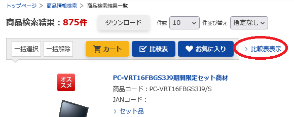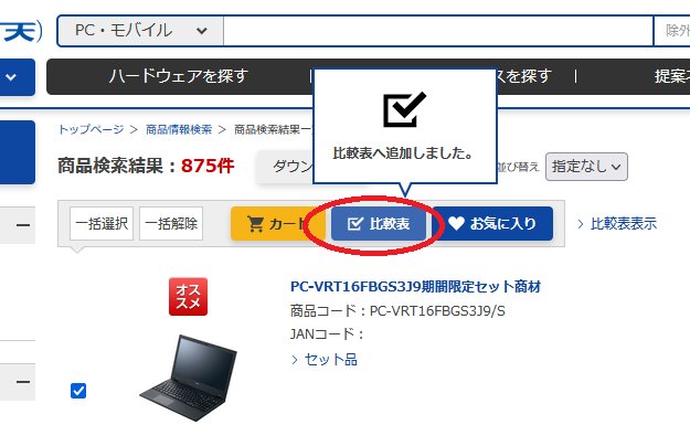 3・比較表に追加した商品を確認する場合は、「比較表表示」のリンクをクリックします。