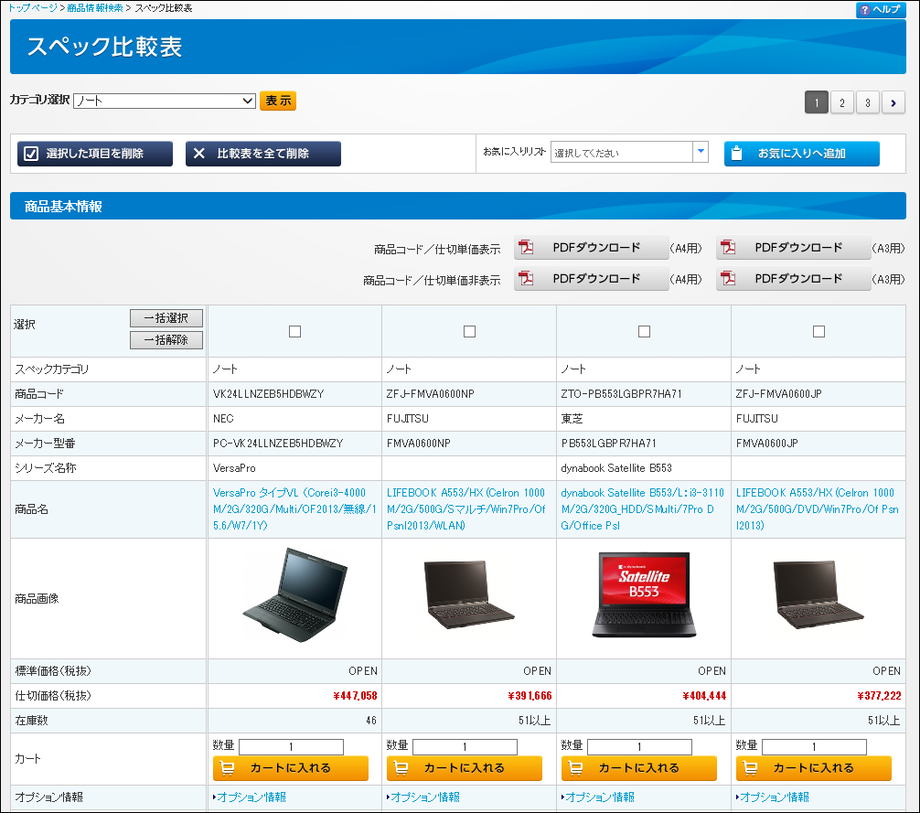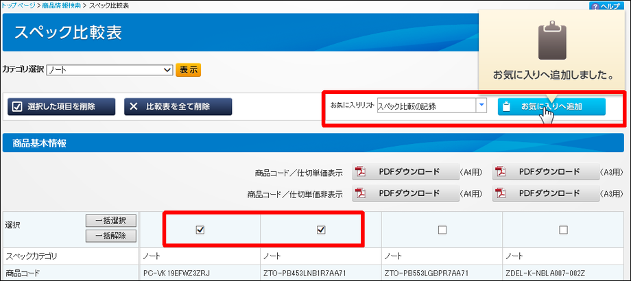スペック比較表では、最大12商品のスペック情報を画面上で比較したり、PDF保存することができます。