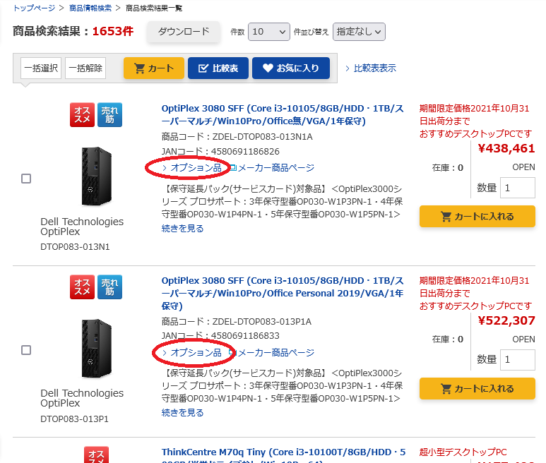 1・商品検索結果で、オプション品の検索ができる商品では、「オプション品」のリンクが表示されます。