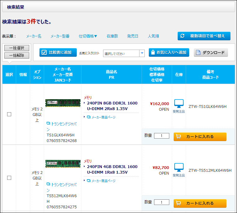 検索されたオプション商品をカートに入れたり、比較表に追加、お気に入りへ追加、ダウンロードすることができます