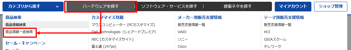 1・「ハードウェアを探す」(もしくは「ソフトウェア・サービスを探す」)より「商品情報検索」を選択します。
