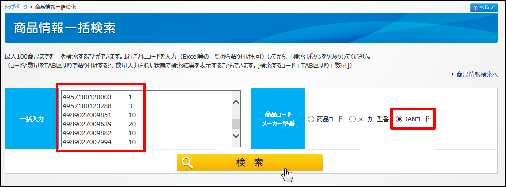 ※一括検索できる最大件数は100商品までになります。