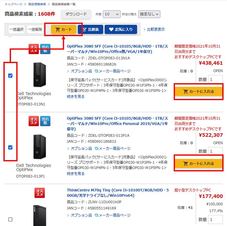 または、チェックを付けた商品を「カート」ボタンで、まとめてカートに入れることもできます。