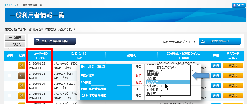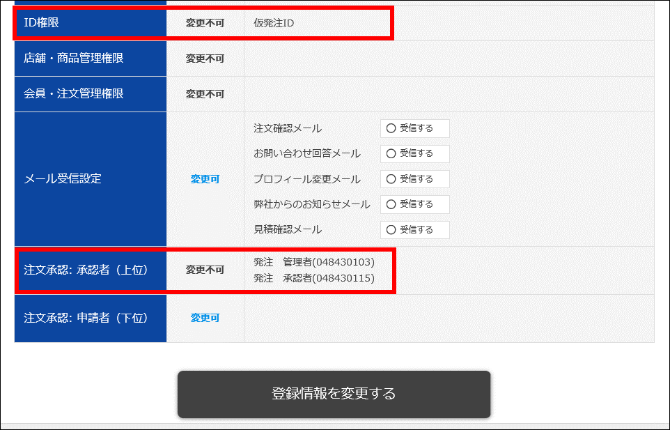 ※仮発注IDの追加登録や変更ができない場合は、弊社営業担当者に『管理者が発行可能なID権限』の設定変更を依頼してください。