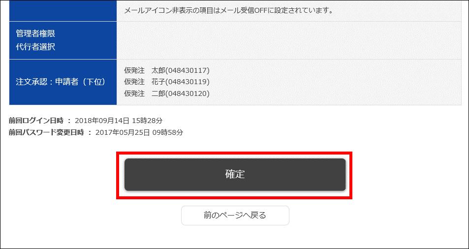 発注IDを持つ承認者となる方が、最初に設定を行う必要があります。 この設定を行わないと、仮発注IDの申請者が仮注文をしようとすると「承認者情報の取得に失敗しました」とエラーになります。 1段階承認と2段階承認で設定手順が異なります。2段階承認の場合はこちらをご覧ください。