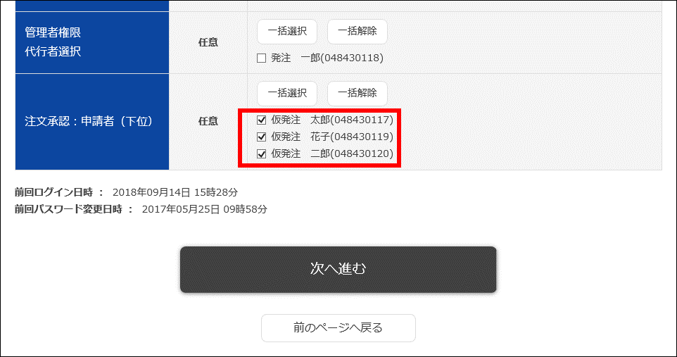 申請者として設定する担当者チェックを付け、「次へ進む」ボタンをクリックします。