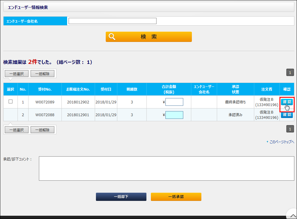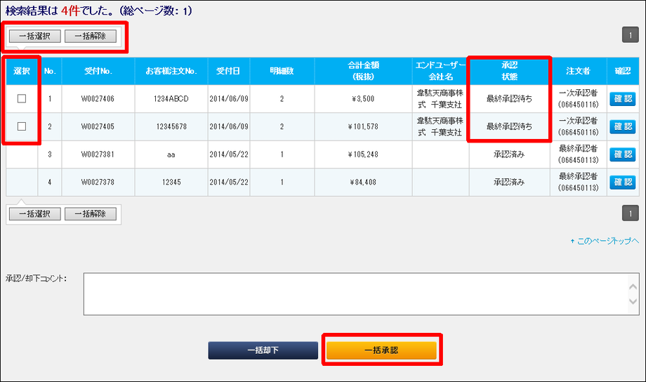 承認者の場合は、承認状態検索の検索結果一覧で、選択欄のチェックボックスにチェックを付けて、「一括承認」ボタンをクリックすることで、まとめて複数件の注文を承認する事も可能です。