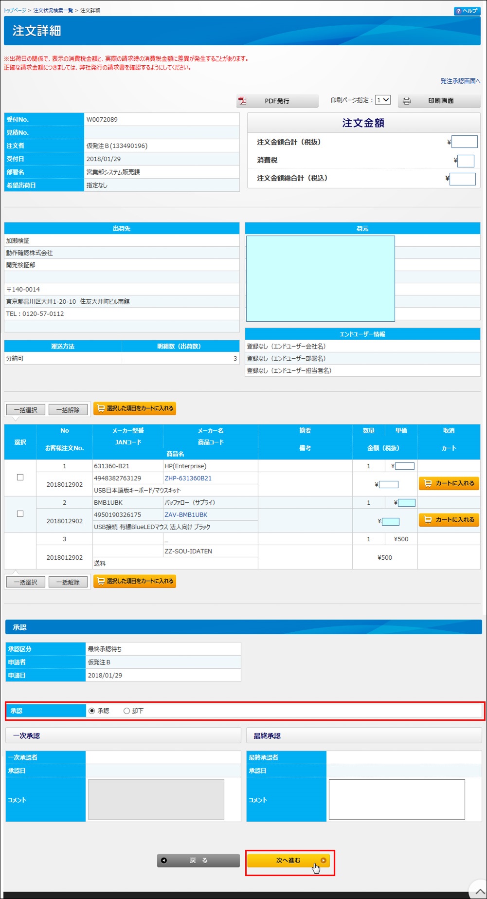 仮注文の内容を確認したら、承認/却下のラジオボタンをどちらかを選択します。