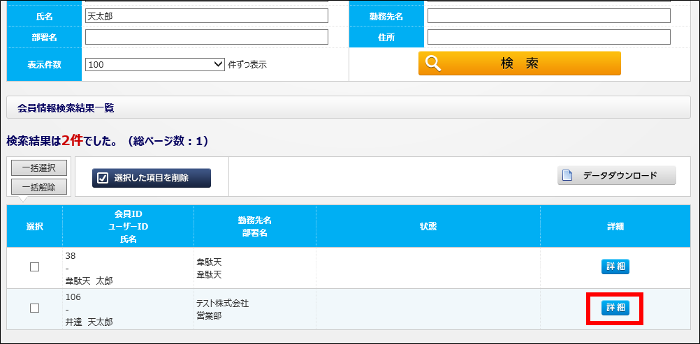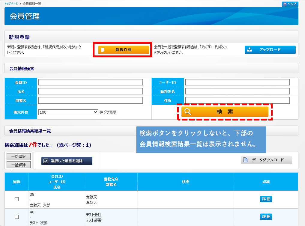 2・会員管理画面が表示されます。登録済みの会員情報を確認する場合は、検索ボタンをクリックしてください。