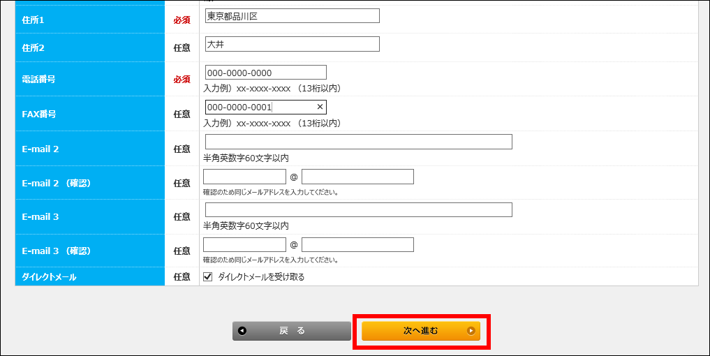4・必要な項目に入力しましたら、「次へ進む」ボタンをクリックします。