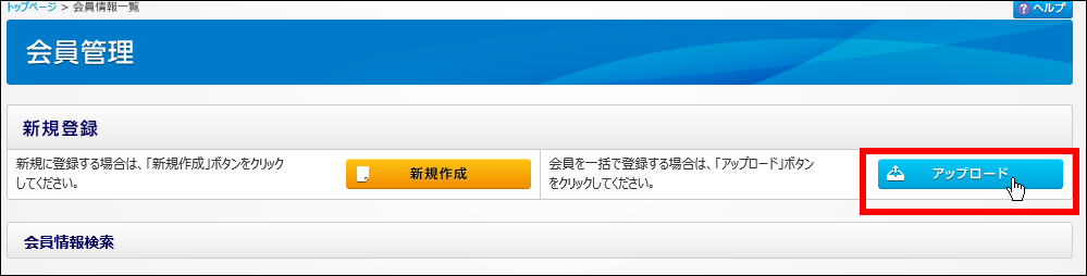 1・会員情報を一括でアップロードしたい場合は、「アップロード」ボタンをクリックします。