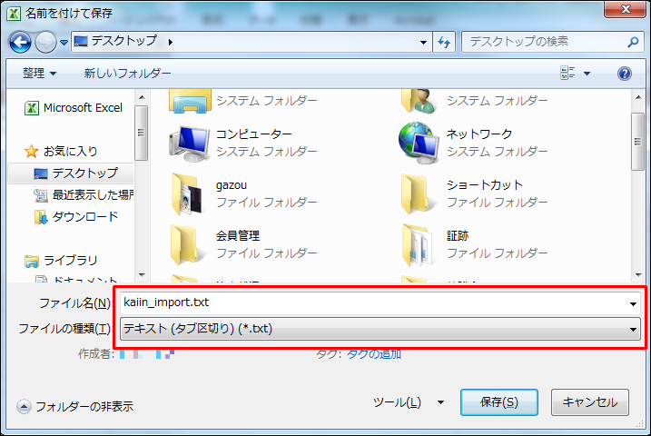 保存の際に、ファイルの種類をテキスト(タブ区切り)(*.txt)にします。