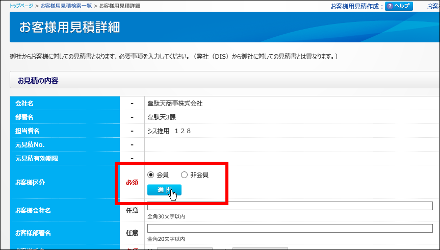 1・お客様区分の「会員」を選択して選択ボタンをクリックします。