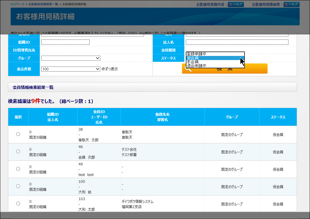 ※iDATEN(韋駄天)Plusを契約されている場合は、ステータスの「仮会員」を選択してから、検索を行うようにしてください。