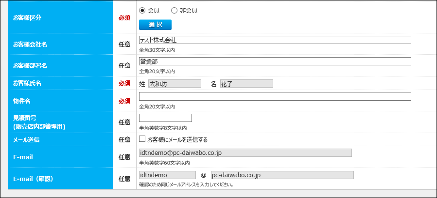 3・検索結果から選択をすると、会員情報がお客様見積作成の宛先として入力されます。