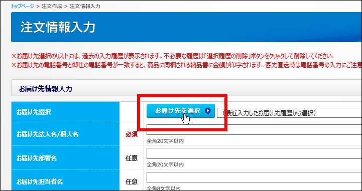1・注文情報入力画面でお届け先を選択ボタンをクリックします。