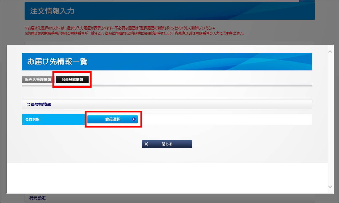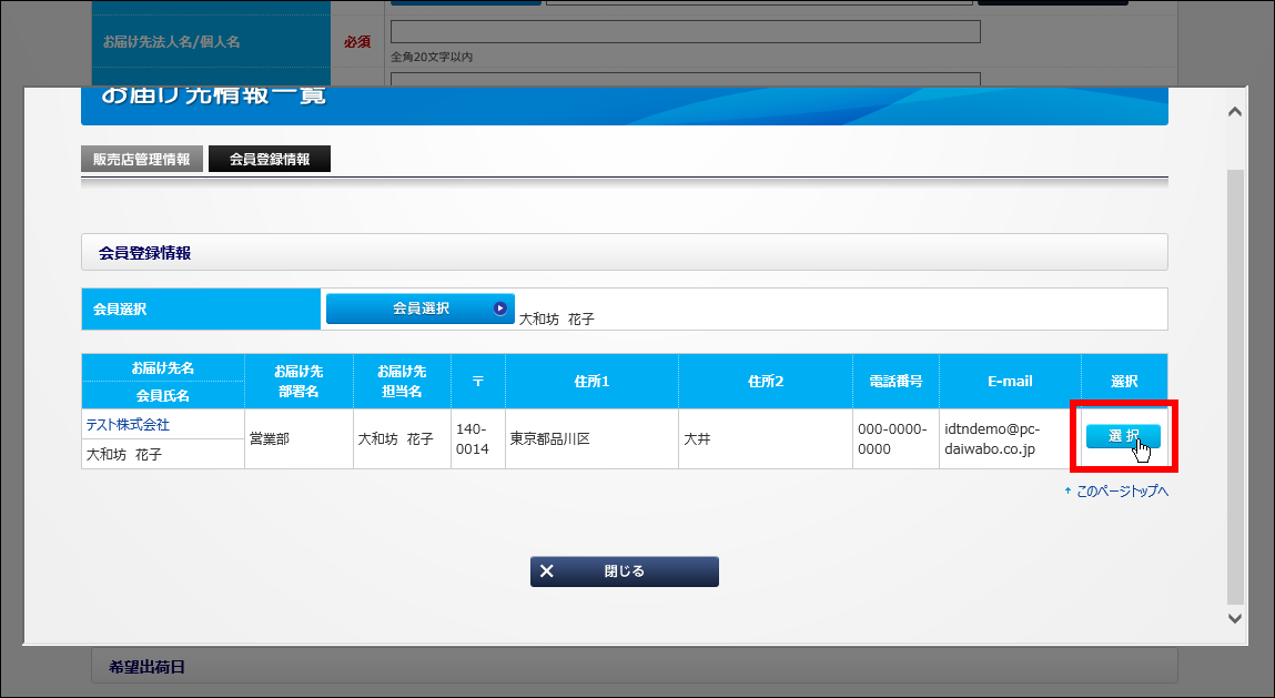 4・会員の住所情報が表示されます、選択ボタンをクリックするとお届け先の宛先として入力されます。