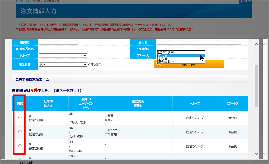 2・ここでは仮会員のステータスを選択してから会員を検索します。