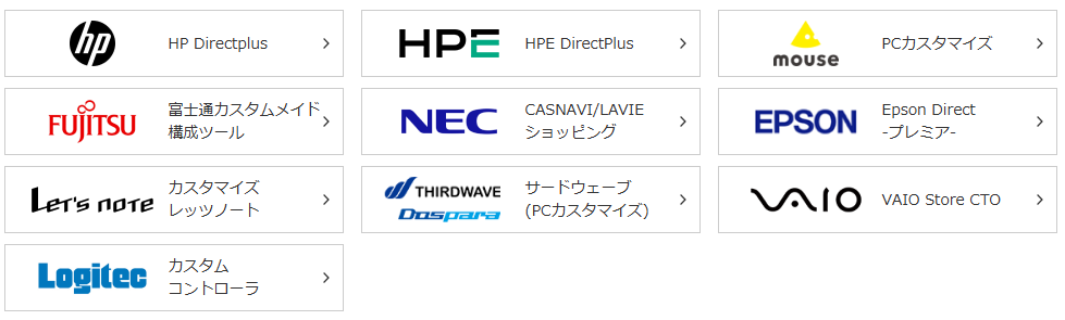 各メーカーの構成作成サイトと連携して、スペック構成や付随するサービスなどが選択できる、カスタマイズモデルの見積を作成することができます。