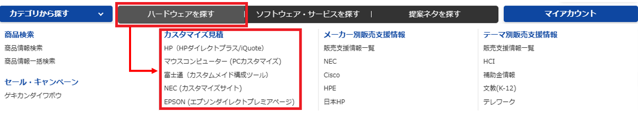 上部メニューの「ハードウェアを探す」>「カスタマイズ見積」、またはHOMEに表示される「カスタマイズ見積」のバナーをクリックすると、対応メーカーサイトにアクセスすることができます。