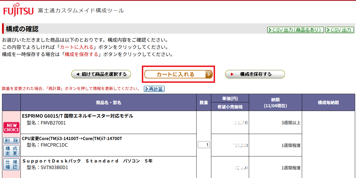 内容を確認の上、「カートに入れる」や「見積り作成」のボタンを選択して確定を行います。