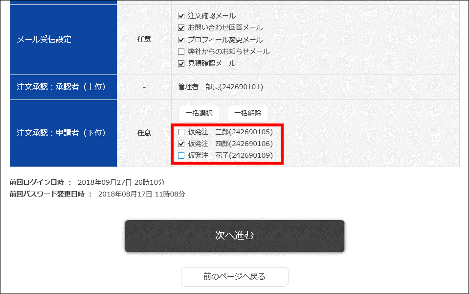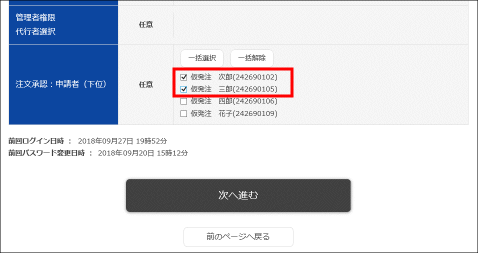 その後で、一次承認者に指定された仮発注IDの方が、別の仮発注IDの方を申請者(下位)として指定します。