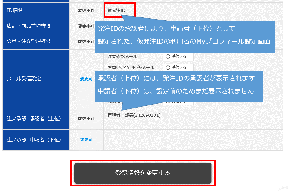 ・仮発注ID(一次承認者)側のMyプロフィール設定画面
