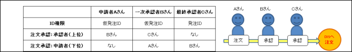 申請者(仮発注ID)が入力した仮注文を、一次承認者(仮発注ID)が承認する事により最終承認者(発注ID)への承認依頼へ変わります。
